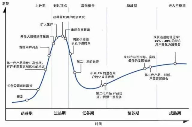 Gartner根据分析预测来推论各种新科技的成熟演变速度及要达到成熟所需的时间,曲线分成5个阶段:技术诞生的触发期 (Technology Trigger):媒体的过度曝光等因素导致技术在没有成熟前就被大肆渲染,例如.com公司在1998~2000年之间的非理性疯狂飙升期;期望膨胀的峰值期(Peak of Inflated Expectations):受到高度关注的技术被推到了发展的顶峰期,大量的投资在这一阶段进入;泡沫破裂的幻灭期 (Trough of Disillusionment):由于技术发展等方面首先导致产品无法迅速普及,受关注程度下降;稳步爬升的复苏期 (Slope of Enlightenment):随着技术方面的提升和应用场景的成熟,再次引起公众的兴趣,并且开始真正走向普及;实质生产的成熟期 (Plateau of Productivity):新科技产生的利益与潜力被市场实际接受,进入商业化的成熟阶段。