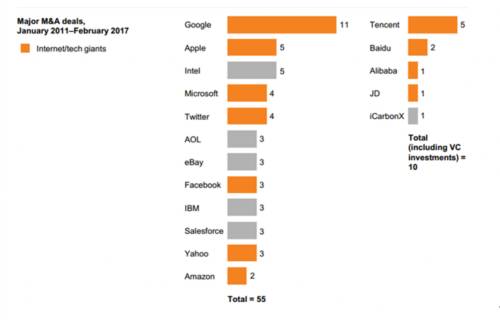 自2011年1月至2017年2月,腾讯收购了5家人工智能公司,百度收购了2家,阿里巴巴与京东各为1家。